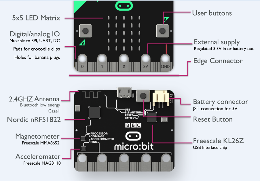 micro:bit是STEM教育用微電腦板。4×5公分的小型電路板上,搭載了25顆LED、2個按鈕、光/溫度/加速度3種感測器、BLE藍牙、25個I/O接口。